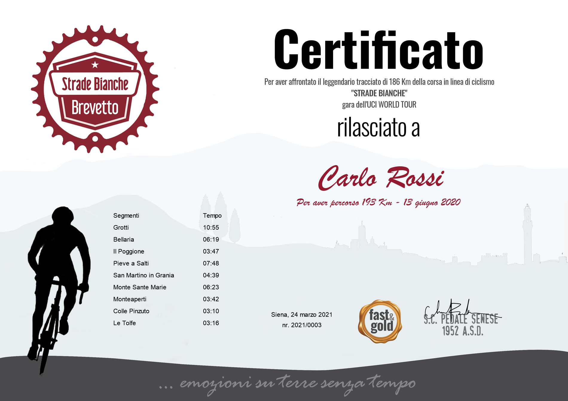 Il Brevetto Strade Bianche Fast & Gold è riservato ai ciclisti che hanno percorso il tracciato della gara maschile di 186 km dislivello complessivo mt. 3.300 con circa 63 km di strade sterrate divise in 11 settori con partenza e arrivo nel centro storico della città di Siena.
