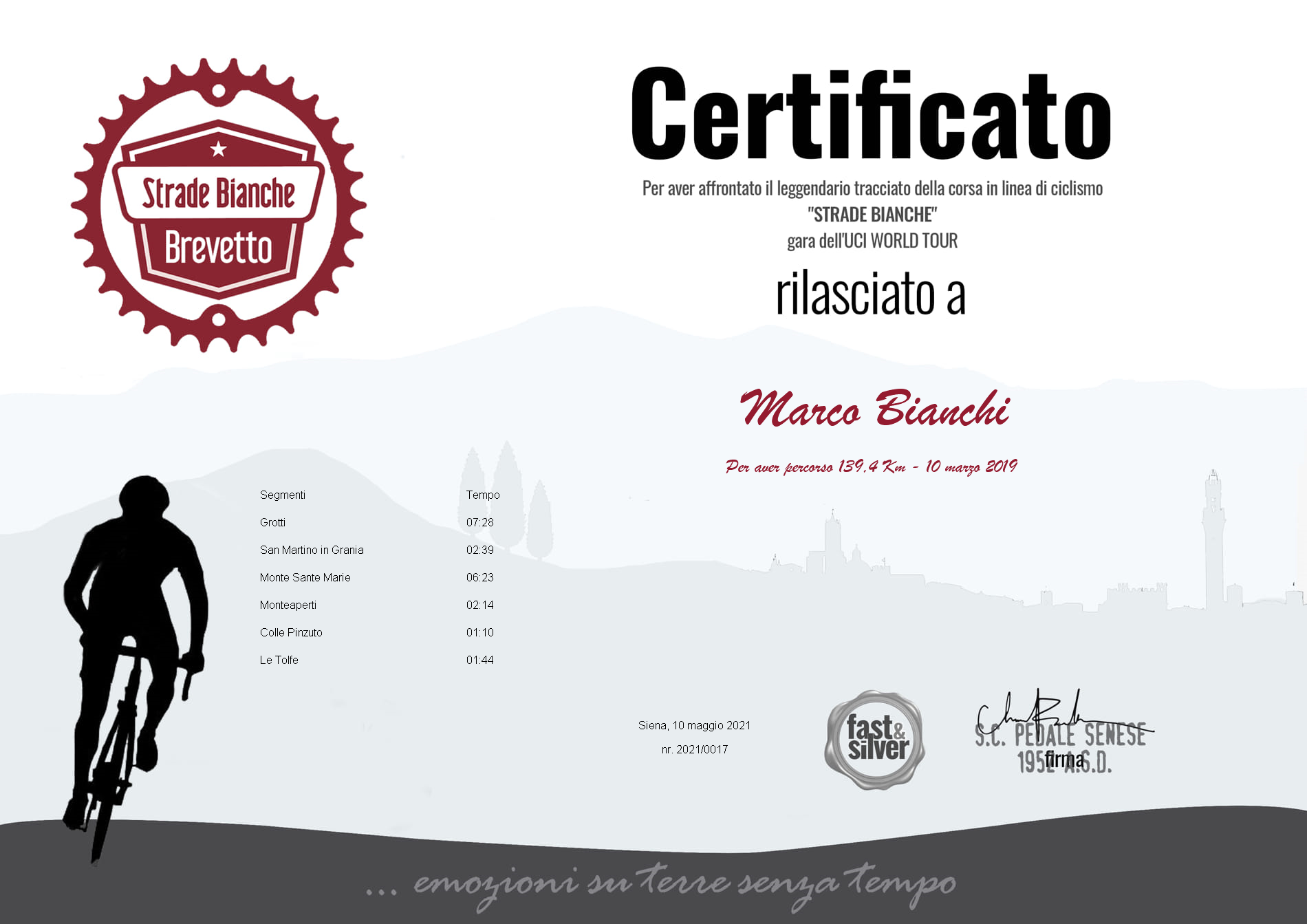 Il Brevetto Strade Bianche Fast & Silver è riservato ai ciclisti che hanno pedalato sul tracciato della Gran Fondo Strade Bianche di 142 km con un dislivello complessivo mt. 2.570 e con 54,7 km di strade sterrate divise in 10 settori con partenza e arrivo nel centro storico della città di Siena. Percorso in gran parte coincidente con la gara femminile Women Élite.