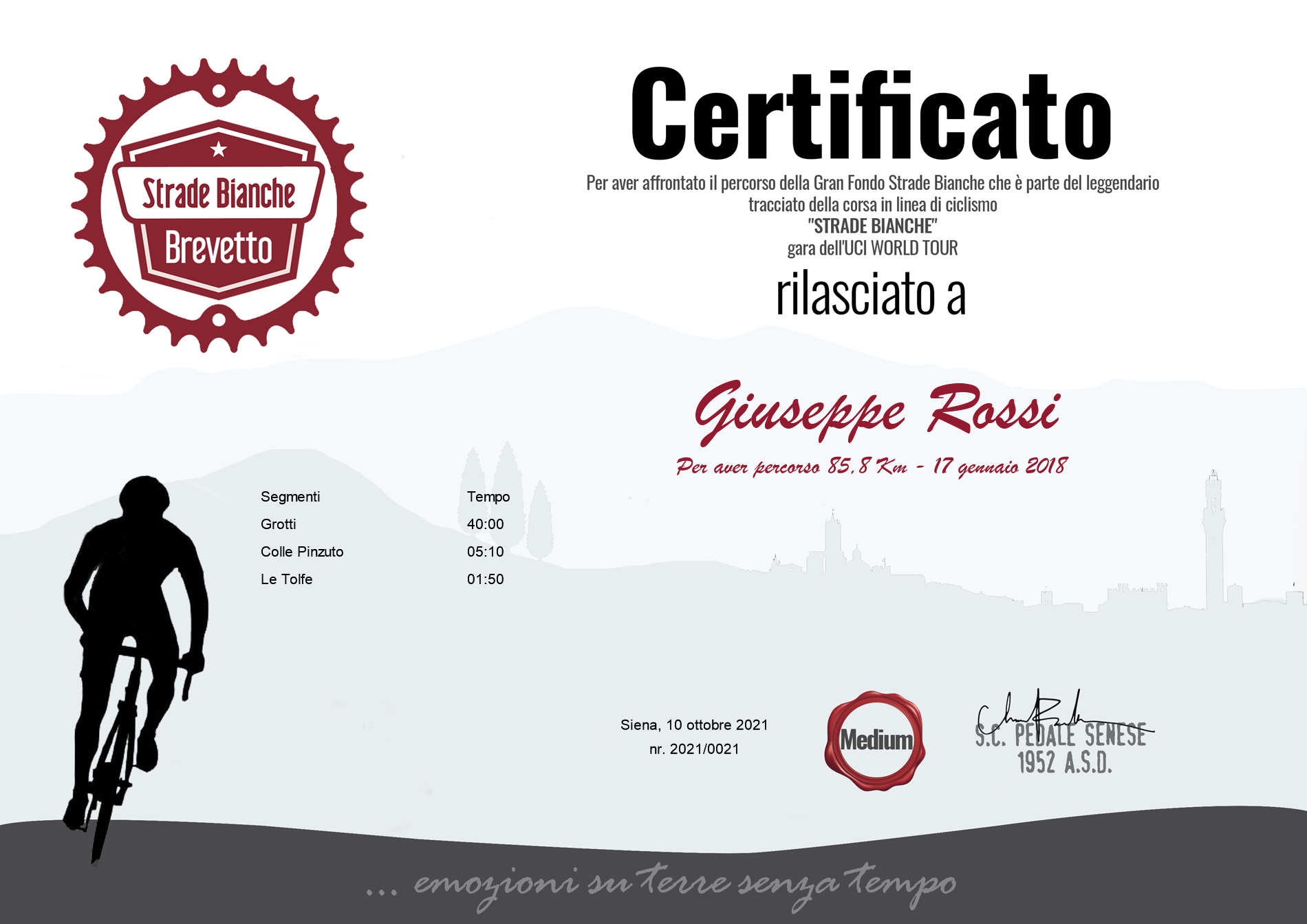 ll Brevetto Strade Bianche Medium è riservato ai ciclisti che hanno percorso il tracciato della Gran Fondo Strade Bianche di 86 km con un dislivello complessivo di mt. 1.340 con 21,6 km di sterrato divise in 6 settori con partenza e arrivo nel centro storico della città di Siena.